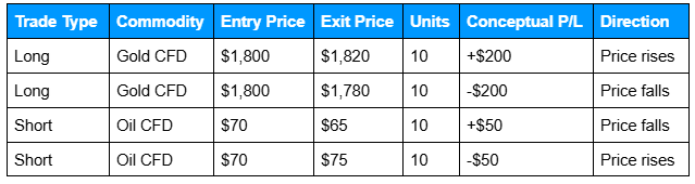 To illustrate how commodity CFDs behave, here are some hypothetical examples showing long and short positions, along with conceptual profit and loss: