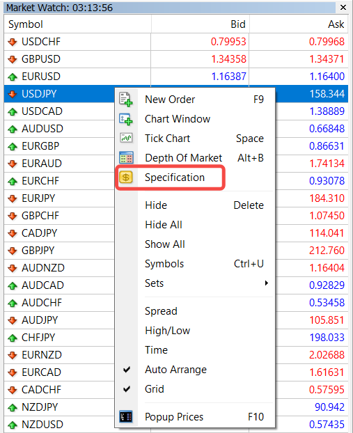 In MT4, open Market Watch, right-click the desired product, and select “Specification” from the menu.