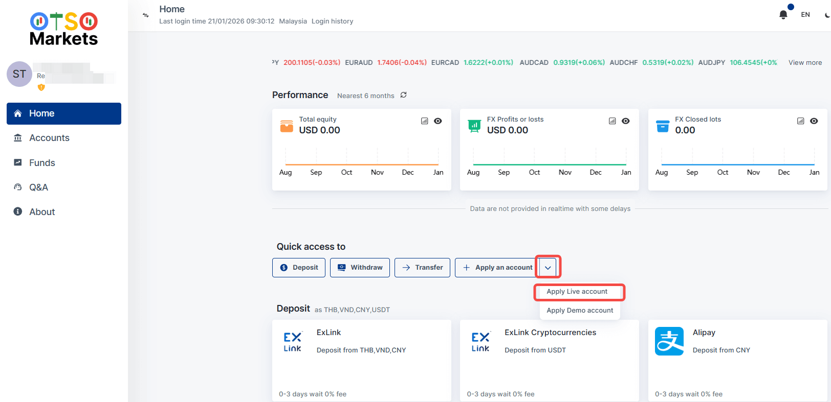 Alt text: Screenshot of the OTSO Markets trading platform showing how to get quick access to applying for a live account.
